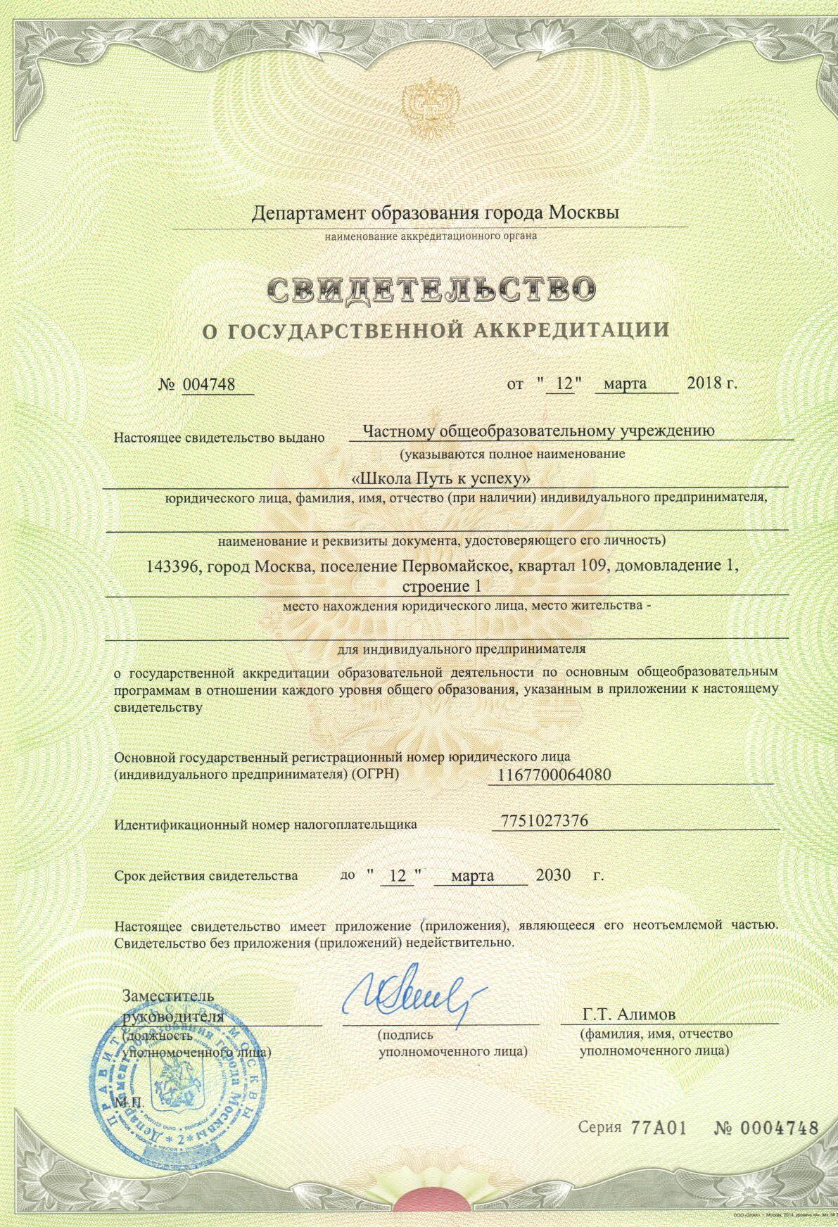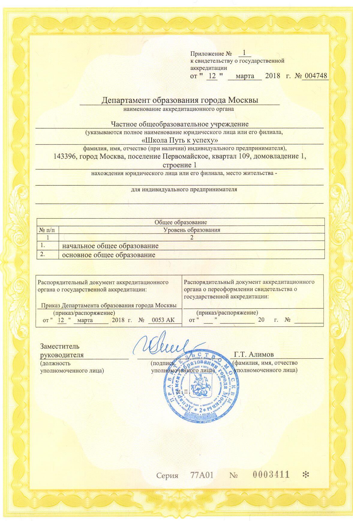 Лицензия №038312 от 31.03.2017г. на осуществление общеобразовательной деятельности. Свидетельство о государственной аккредитации №004748 от 12.03.2018г. Сайт школы на государственном портале "Департамента образования города Москвы".
