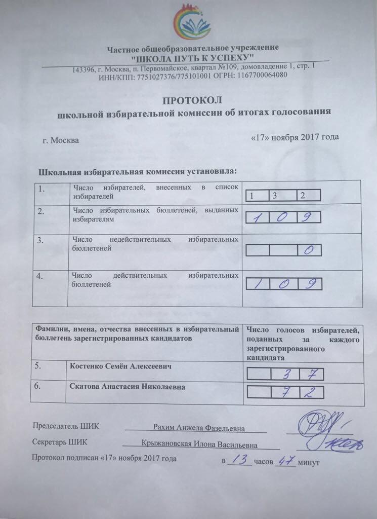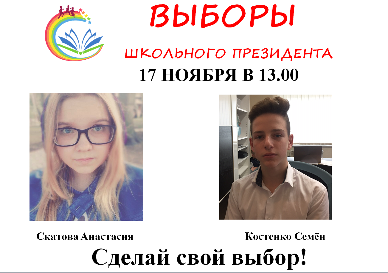 17 ноября 2017 года состоялись выборы на пост президента школы. Свои кандидатуры выдвинули 2 ученика: Скатова Анастасия (9кл.) и Костенко Семён (8кл.). В 13 часов 00 минут избирательный участок начал свою работу. В 13 часов 40 минут выборы были закончены, и избирательная комиссия приступила к подсчету голосов. Выборы и подведение итогов проведено в строгом соответствии с законом о выборах. Как и в большой политике, голосование проводилось тайно, и его итоги подводила специальная избирательная комиссия. Президентская гонка была напряженной.