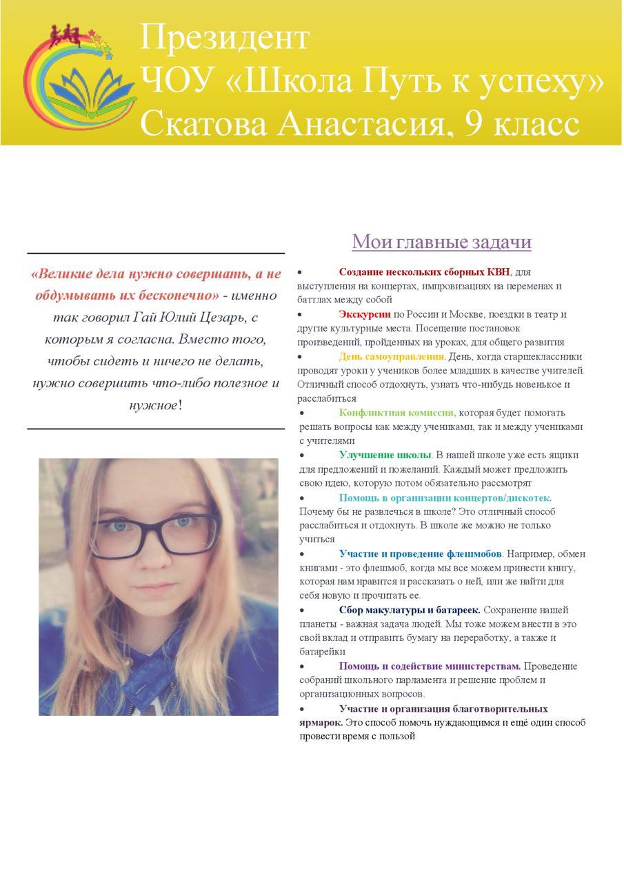 По итогам выборов президентом школы была избрана учащаяся 9 класса Скатова Анастасия. Поздравляем с победой!